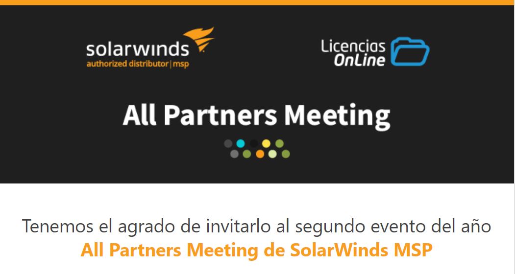 Licencias OnLine realiza una invitación al evento virtual All Partners Meeting, cuyo objetivo es enseñar a los partners a hacer negocios con SolarWind MSP; compañía estadounidense que desarrolla software empresarial para ayudar a administrar sus redes, sistemas e infraestructura de tecnología de la información.